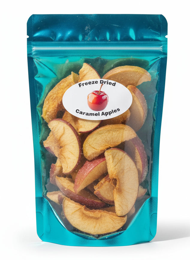 Caramel apples are freeze-dried for a crunchy, sweet treat that blends fruit and caramel flavors in an easy-to-carry bag.