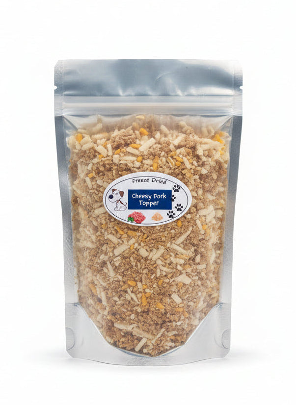 A freeze-dried pork and cheese topper that adds real protein and flavor to your dog's meals. Mix with kibble or wet food for enhanced nutrition without artificial ingredients.