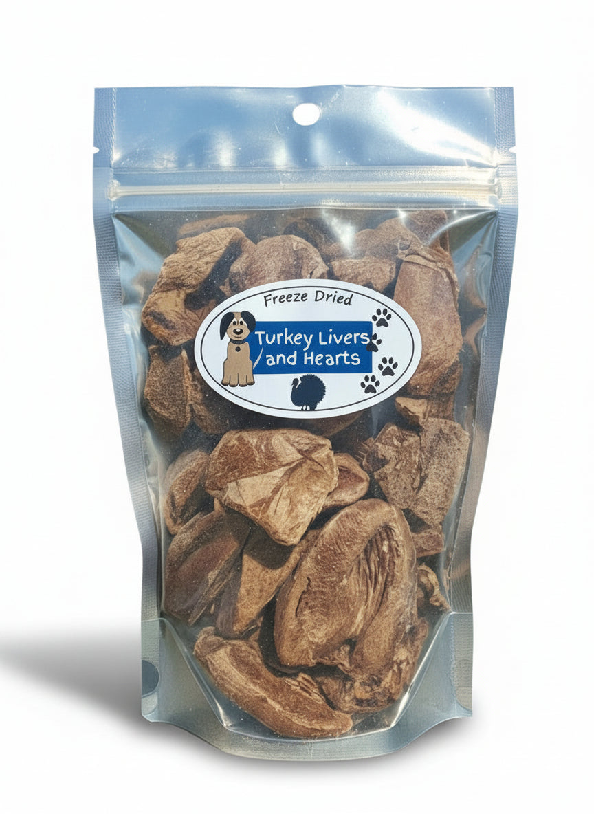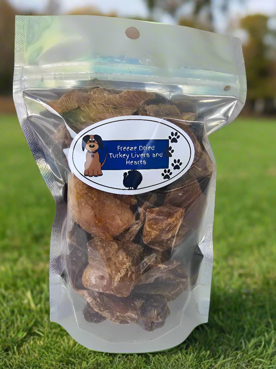 The turkey livers and hearts come from our pasture-fed animals and are hand trimmed. This results in larger pieces of liver and halved hearts. It is an ideal choice for larger dog breeds and a popular training treat among canines.